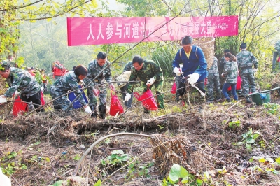 “护卫队”正在清理岸边垃圾 本报记者 周新宇 摄