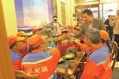 进入店内,六七张桌子上已经摆好了碗筷,11点半左右,环卫工们开始陆续就座,待菜品陆续上桌后,他们就卷起袖子忙起来,往锅里下食材,有说有笑,场面非常温馨。据了解,当天前来就餐的都是龙塔社区周边路段打扫卫生的环卫工,一共45人。“平时打扫城区卫生早出晚归非常辛苦,今天能够趁着中午下班时间与同事一起吃火锅,我感到非常开心,很感谢社区和火锅店老板的一片热忱。”其中一位环卫工人说。