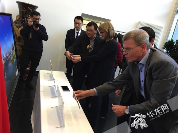 杜塞尔多夫副市长和杜伊斯堡副市长通过AR技术感受立体的重庆。首席记者 佘振芳 摄