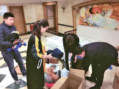 志愿者们将收集的衣服打包并写下地址 本报记者 蒋婧 摄