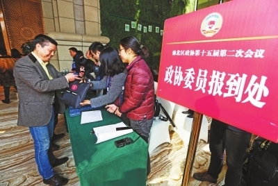 1月11日下午,参加政协渝北区第十五届委员会第二次会议的委员们陆续前往会务处报到
