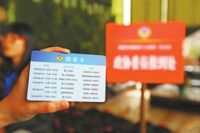 “今年,我们根据每位委员的具体安排,为委员们一一定制了信息卡。”区政协工作人员介绍说,“信息卡既便于直接查看,又不容易污损,还能让与会人员在最短时间内熟悉会议安排,提高委员参会效率。”